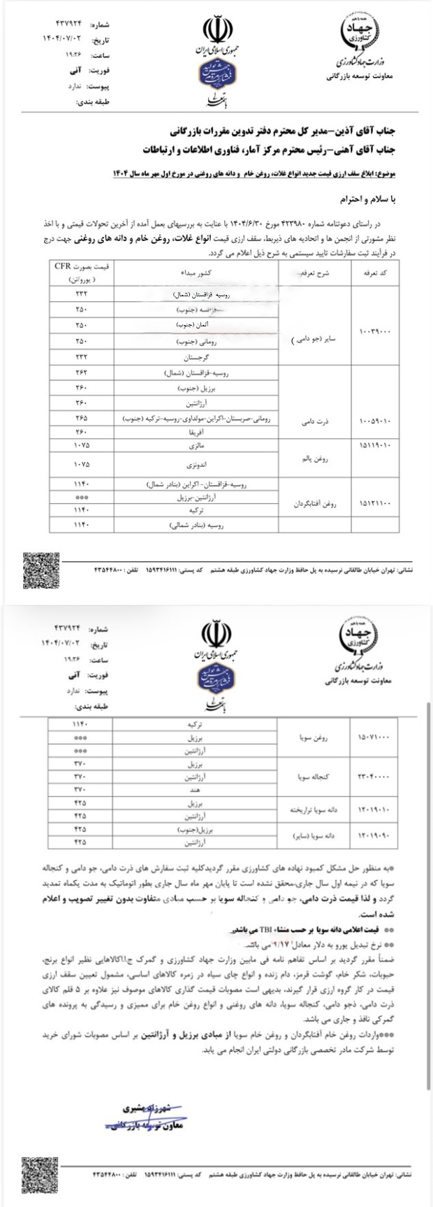 معاونت توسعه بازرگانی وزارت جهاد کشاورزی سقف قیمت ارز کالاهای اساسی شامل جو، ذرت، روغن خام و دانههای روغنی را مورخ اول مهر مشخص کرد. هدف از این اقدام، مدیریت بازار، حمایت از تولیدکنندگان و واردکنندگان و حفظ ثبات قیمتی در بازار نهادههای کشاورزی است.