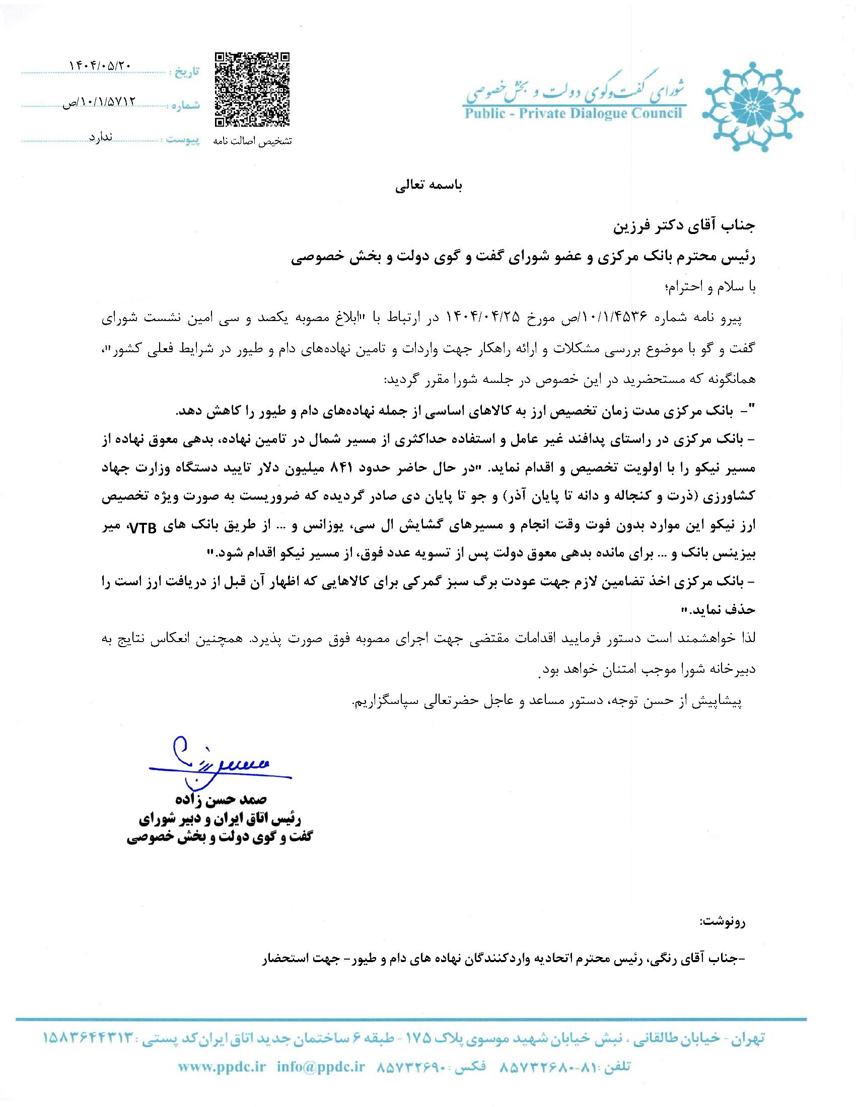 شورای گفت‌وگوی دولت و بخش خصوصی در نامه‌ای رسمی به رئیس کل بانک مرکزی خواستار اجرای فوری مصوبه واردات نهاده‌های دامی و طیور شد. این درخواست در شرایطی مطرح شده که تولیدکنندگان دام و کشاورزی با مشکلات جدی در تأمین خوراک دام و طیور مواجه هستند و تسهیل فرآیند واردات ضروری است.