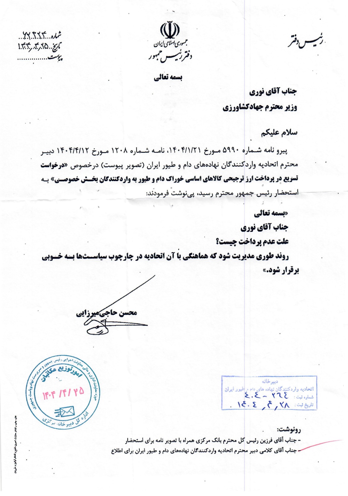 تأخیر ۹ ماهه در تخصیص ارز به واردکنندگان نهاده‌های دامی، موجب افزایش قیمت‌ها و نگرانی از گسترش بحران به سایر اقلام شده است. این موضوع با واکنش رئیس‌جمهور و پیگیری برخی نمایندگان مجلس، از جمله طرح پرسش از وزیر جهاد کشاورزی، همراه بوده است.