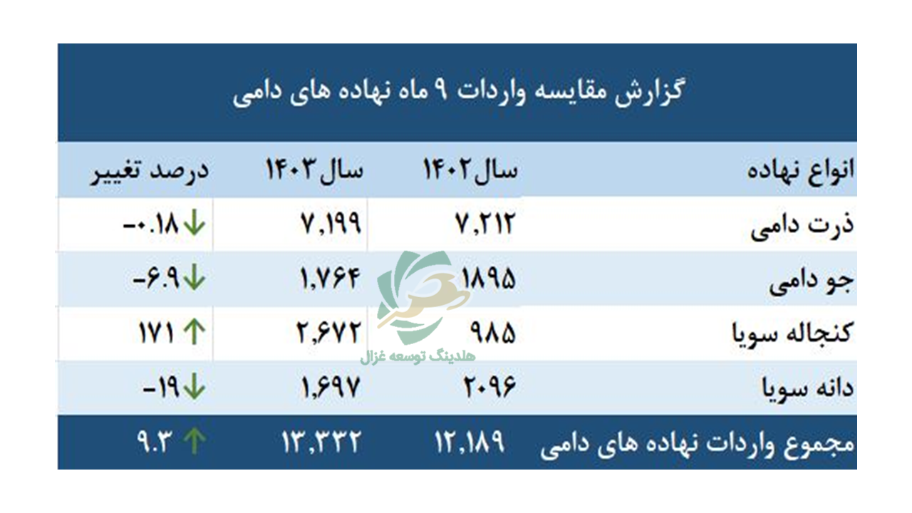 مقایسه واردات 9 ماهه نهاده های دامی در سال های 1402 و 1403